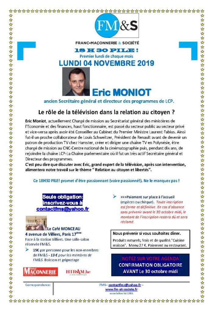 Eric Moniot, actuellement Chargé de mission au Secrétariat général des ministères de l’Economie et des finances, haut fonctionnaire, est passé du secteur public au secteur privé et vice-versa après avoir été Conseiller au Cabinet du Premier Ministre Laurent Fabius. Ainsi fut-il un proche collaborateur de Louis Schweitzer, Président de Renault avant de devenir un patron de production TV chez Hamster, créer et diriger une chaîne TV en Polynésie, être chargé de mission au CNC-Centre national de la cinématographie puis de rejoindre la chaîne LCP-La Chaîne parlementaire où,, pendant dix ans, il fut un très actif Secrétaire général et Directeur des programmes.
