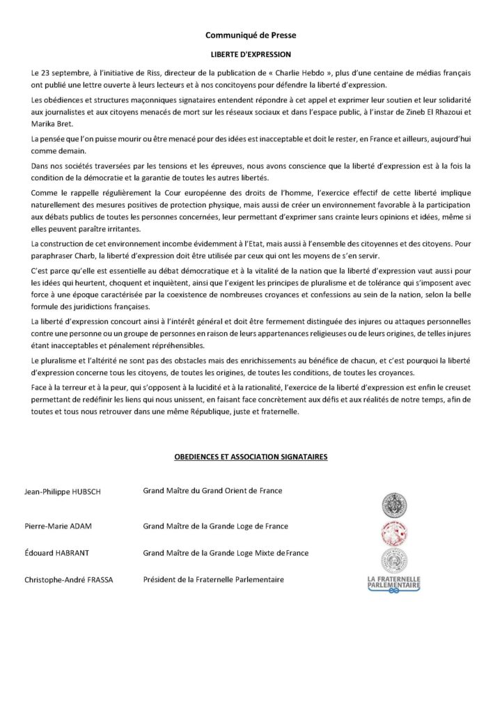 Communiqué de presse interobédientiel sur la liberté d’expression signé par 3 obédiences maçonniques (GODF, GLDF et GLMF) et la Fraternelle Parlementaire