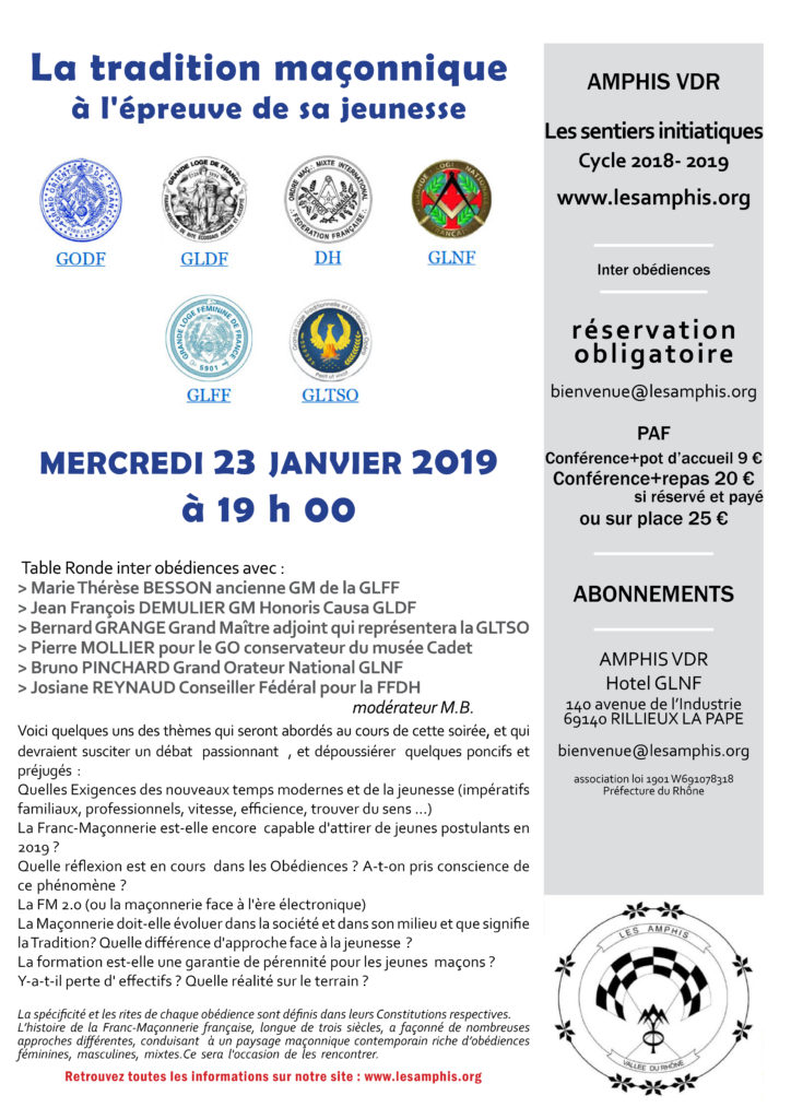 | Table Ronde inter obédiences avec : > Marie Thérèse BESSON ancienne GM de la GLFF > Jean François DEMULIER GM Honoris Causa GLDF > Bernard GRANGE Grand Maître adjoint qui représentera la GLTSO > Pierre MOLLIER pour le GO conservateur du musée Cadet > Bruno PINCHARD Grand Orateur National GLNF > Josiane REYNAUD Conseiller Fédéral pour la FFDH Voici quelques uns des thèmes qui seront abordés au cours de cette soirée, et qui devraient susciter un débat passionnant , et dépoussiérer quelques poncifs et préjugés : Quelles Exigences des nouveaux temps modernes et de la jeunesse (impératifs familiaux, professionnels, vitesse, efficience, trouver du sens …) La Franc-Maçonnerie est-elle encore capable d’attirer de jeunes postulants en 2019 ? Quelle réflexion est en cours dans les Obédiences ? A-t-on pris conscience de ce phénomène ? La FM 2.0 (ou la maçonnerie face à l’ère électronique)La Maçonnerie doit-elle évoluer dans la société et dans son milieu et que signifie la Tradition? Quelle différence d’approche face à la jeunesse ? La formation est-elle une garantie de pérennité pour les jeunes maçons ? Y-a-t-il perte d’ effectifs ? Quelle réalité sur le terrain ?La spécificité et les rites de chaque obédience sont définis dans leurs Constitutions respectives. L’histoire de la Franc-Maçonnerie française, longue de trois siècles, a façonné de nombreuses approches différentes, conduisant à un paysage maçonnique contemporain riche d’obédiences féminines, masculines, mixtes. Ce sera l’occasion de les rencontrer. |
