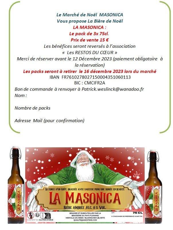 Ce sera aussi l’occasion de découvrir : “MASONICA“ la toute dernière bière de Noël, brassée dans les Flandres spécialement pour nous, ainsi que des chocolateries confectionnées pour cet évènement. Les ventes se feront au profit des Restos du Cœur.