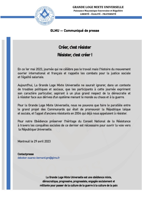 Communiqué de presse de la Grande Loge Mixte Universelle à l’occasion de la Journée internationale des travailleurs ce 1er mai 2023.