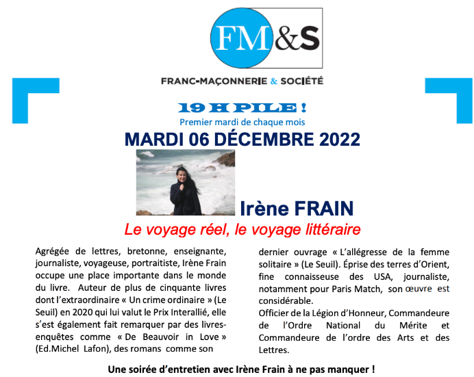 Notre première invitée, écrivaine et journaliste, occupe une place importante dans le monde littéraire et dans celui des médias. Vous aurez le privilège de pouvoir vous entretenir avec Irène FRAIN pendant un dîner-discussion qui promet d’être passionnant.