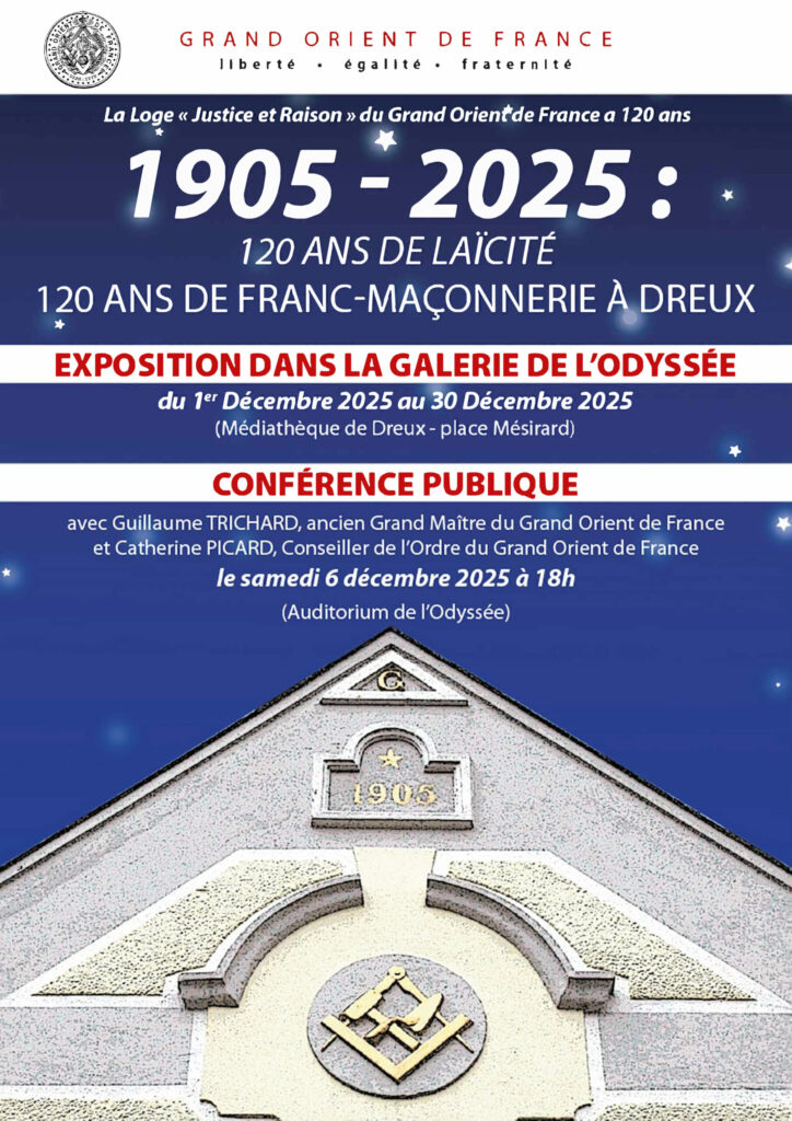 La Loge « Justice et Raison » célèbre en 2025 un double anniversaire : les 120 ans de la loi du 9 décembre 1905, qui fonde la laïcité républicaine, et les 120 ans de présence maçonnique à Dreux. Deux moments forts sont organisés en décembre pour rappeler l’importance de la liberté de conscience, du dialogue, et de la fraternité dans la cité.