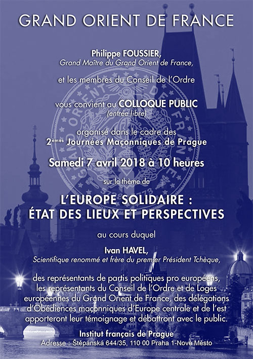 Samedi 7 avril 2018 à 10 heuresPhilippe FOUSSIER, Grand Maître du Grand Orient de France, et les membres du Conseil de l’Ordre vous convient au COLLOQUE PUBLIC (entrée libre) organisé dans le cadre des 2èmes Journées Maçonniques de Prague sur le thème de L’EUROPE SOLIDAIRE : ÉTAT DES LIEUX ET PERSPECTIVES avec :