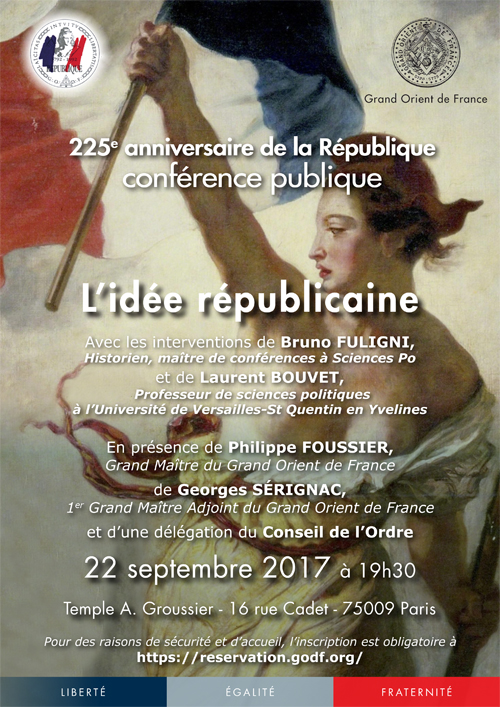Le Conseil de l’Ordre du Grand Orient de France avec le concours la Loge République organise une Conférence publique sur le thème « L’idée républicaine »