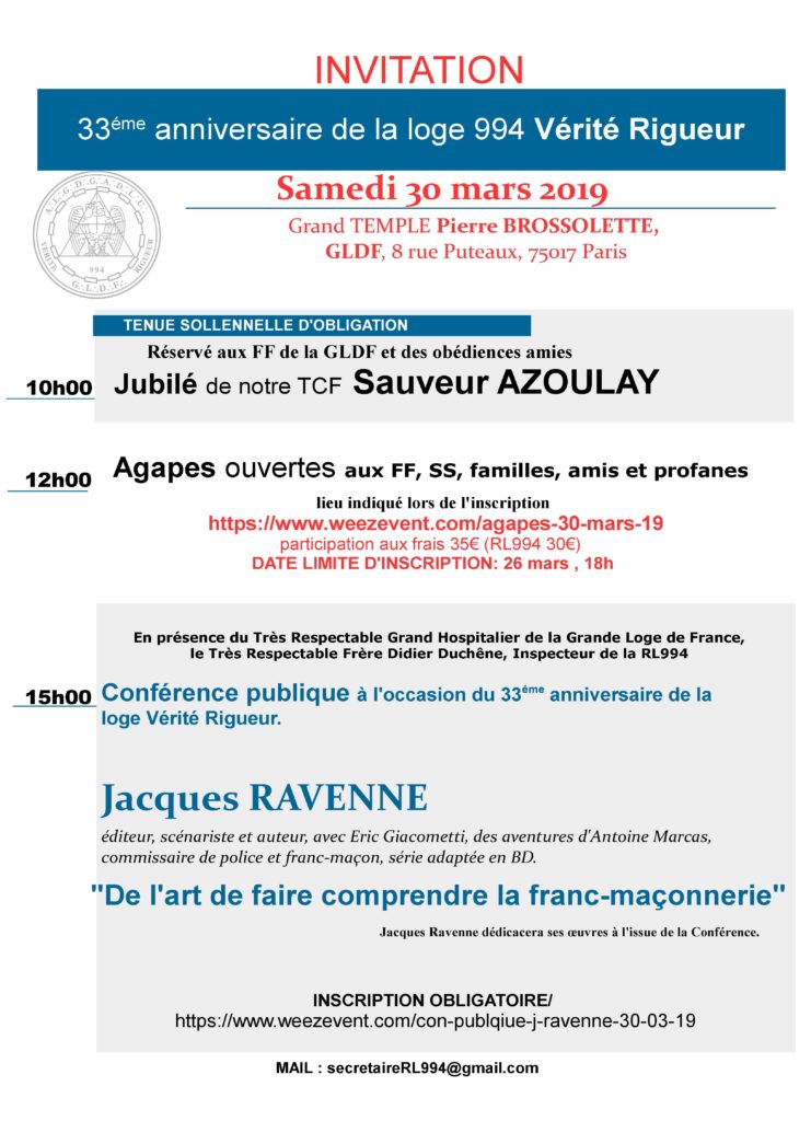 33° ANNIVERSAIRE DE LA LOGE 994 VÉRITÉ RIGUEUR – JUBILE – CONFERENCE