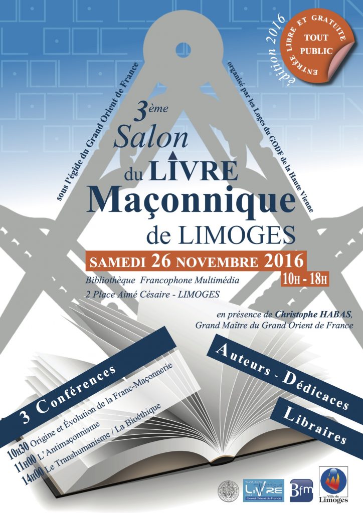 Limoges – 3ème Salon du Livre Maçonnique de Limoges le samedi 26 novembre 2016 de 10h – 18h organisé sous l’égide du Grand Orient de France (GODF) et par les Loges du GODF de la Haute Vienne