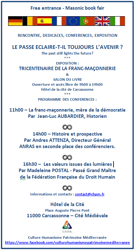 Samedi 01 juillet 2017 de 09 heures à 19 heures, se déroulera le 4ème Salon du livre maçonnique de Carcassonne qui cette année sera sur le thème « Le passé éclaire-t-il l’avenir » – Notre société est parcourue par plusieurs sentiments : le doute, la peur, le repli sur soi, … Ceux-ci ont plusieurs causes : économiques, sociales, politiques.