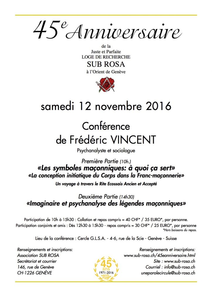 Dans le cadre du 45e Anniversaire de la Loge de Recherche SUB ROSA à l’orient de Genève :