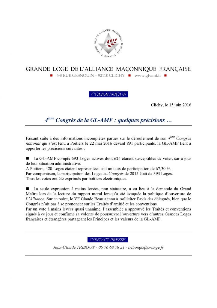 Faisant suite à des informations incomplètes parues sur le déroulement de son 4ème Congrès national qui s’est tenu à Poitiers le 22 mai 2016 devant 891 participants, la GL-AMF tient à apporter les précisions suivantes :