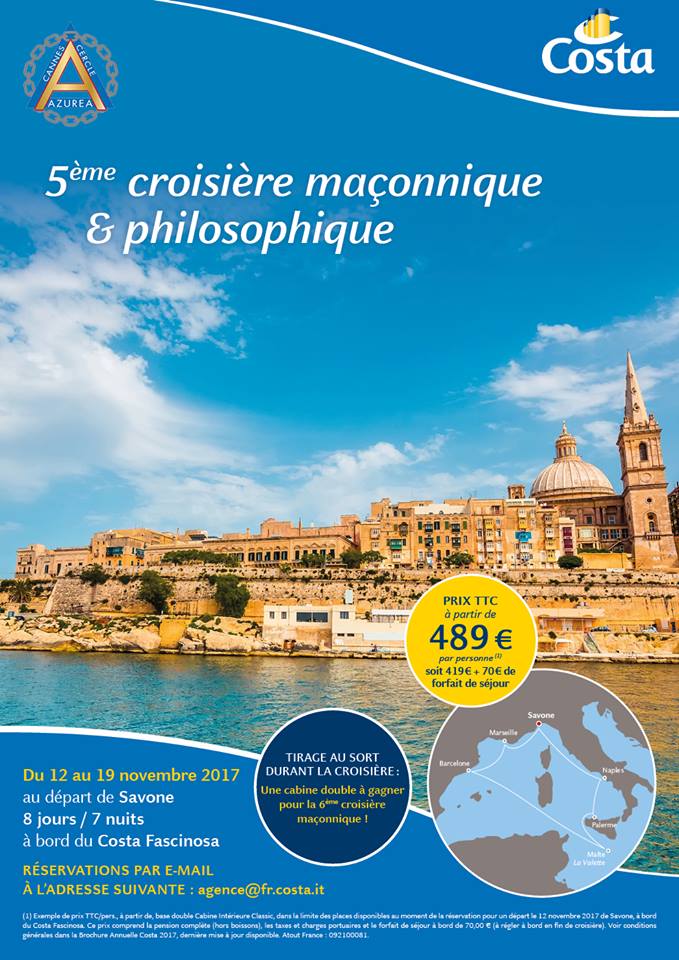 Du 12 au 19 novembre 2017, le Cercle philosophique et philanthropique de réflexion « Cannes Cercle Azurea« , en partenariat avec Costa Croisières, organise sa 5ème Croisière Maçonnique et Philosophique de 08 jours, à bord du Costa Fascinosa, au départ de Savone sur le thème : La Franc-maçonnerie est allotropique, comment le maçon pourra t’ il s’ épanouir au 21ème siècle ?