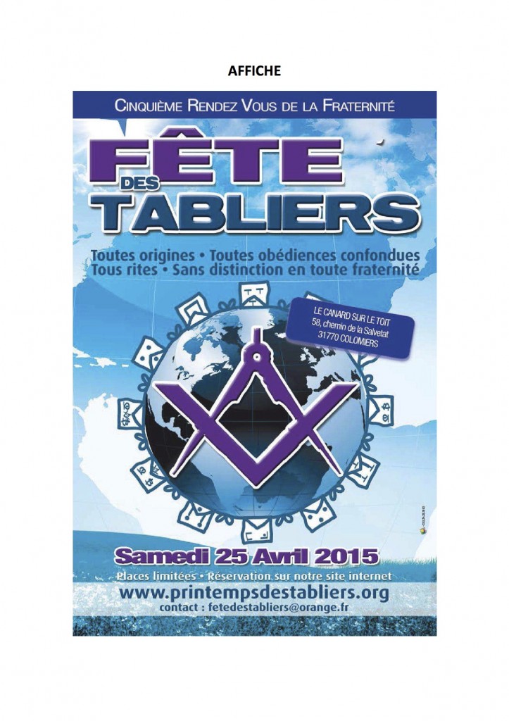 Le 5ème Rassemblement de la Fête des Tabliers se déroulera le samedi 25 avril 2015 avec des francs-maçons et francs-maçonnes de « plus de 14 Obédiences, de toutes origines, de tous rites, sans distinction. et en toute Fraternité »