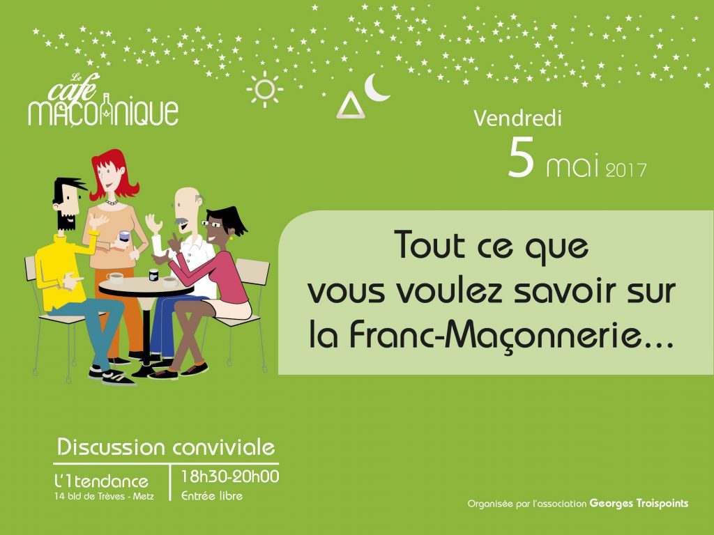 6e café maçonnique « Tout ce que vous voulez savoir sur la franc-maçonnerie… » sera le thème à l’initiative locale de l’Association Georges Trois points de Metz et la Fédération Française le Droit Humain