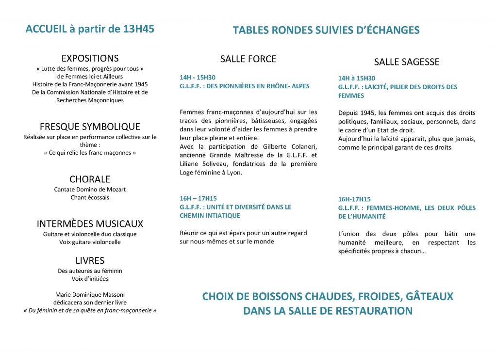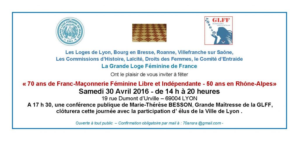 Lyon – Samedi 30 Avril 2016 de 14 h à 20 h – Journée d’information et de fête « 70 ANS D’UNE FRANC MAÇONNERIE FÉMININE LIBRE ET INDÉPENDANTE, 50 ANS EN RHÔNE-ALPES », clôturée par une Conférence à 17 heures 30 de Marie-Thérèse BESSON Grande Maîtresse de la Grande Loge Féminine de France (GLFF) sur le thème « LA DÉMARCHE MACONNIQUE : UNE RÉPONSE A VOS QUESTIONNEMENTS »