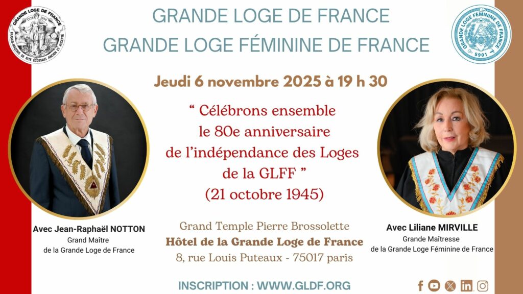 Le jeudi 6 novembre 2025 à 19 h 30 (ouverture des portes à 18 h 45), l’Hôtel de la Grande Loge de France (8 rue Louis Puteaux, 75017 Paris) accueillera une conférence publique exceptionnelle, organisée conjointement par la Grande Loge Féminine de France (GLFF) et la Grande Loge de France (GLDF).