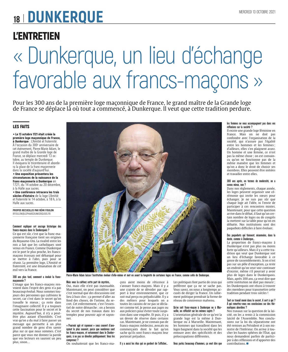 Le journal « Le Phare DunKerquois » a publié un entretien Pierre Marie ADAM, Grand Maître de la Grande Loge de France (GLDF)