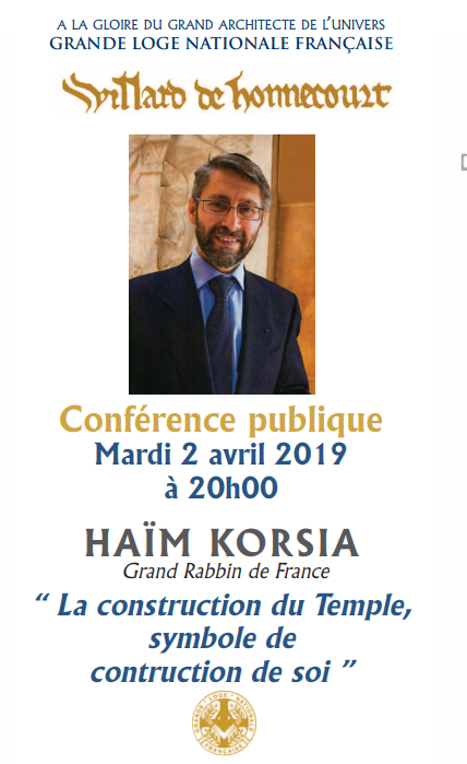 Le thème qu’il abordera, « la construction du temple, symbole de construction de soi », inspire un mythe qui est fondamental dans la tradition maçonnique et dans ses pratiques rituelles, et on ne doutera pas que Haïm Korsia apportera des éclairages nouveaux sur ce sujet en nous présentant la vision du savoir rabbinique sur la question.