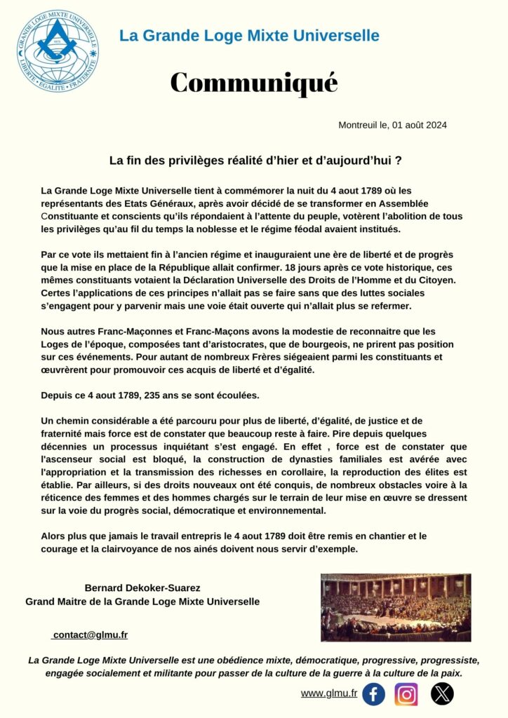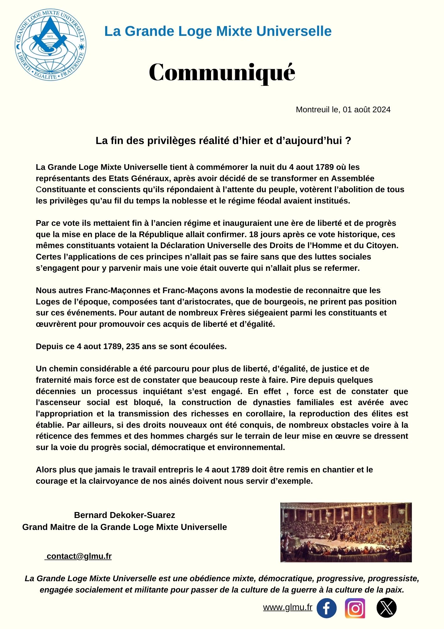 ABOLITION DES PRIVILEGES | GLMU Evenements | 5 août 2024 | 0 | by A.S. Communiqué de la Grande Loge Mixte Universelle (GLMU) au sujet de l’abolition des privilèges.