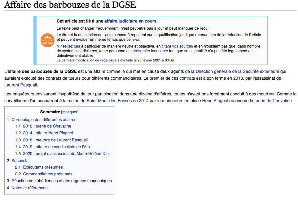 Au même titre que la célèbre « affaire des fiches« , parfois appelée l’affaire des casseroles, l’Affaire des barbouzes de la DGSE mélant des francs-maçons bénéficie de sa fiche Wikipédia !