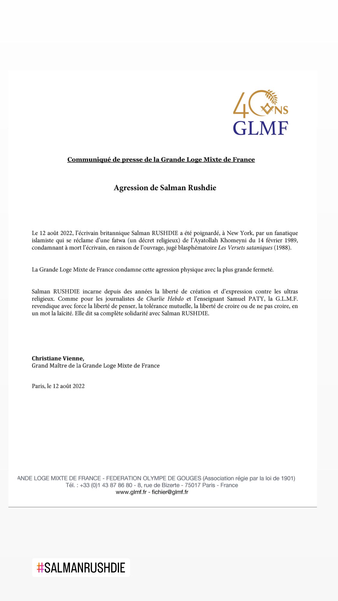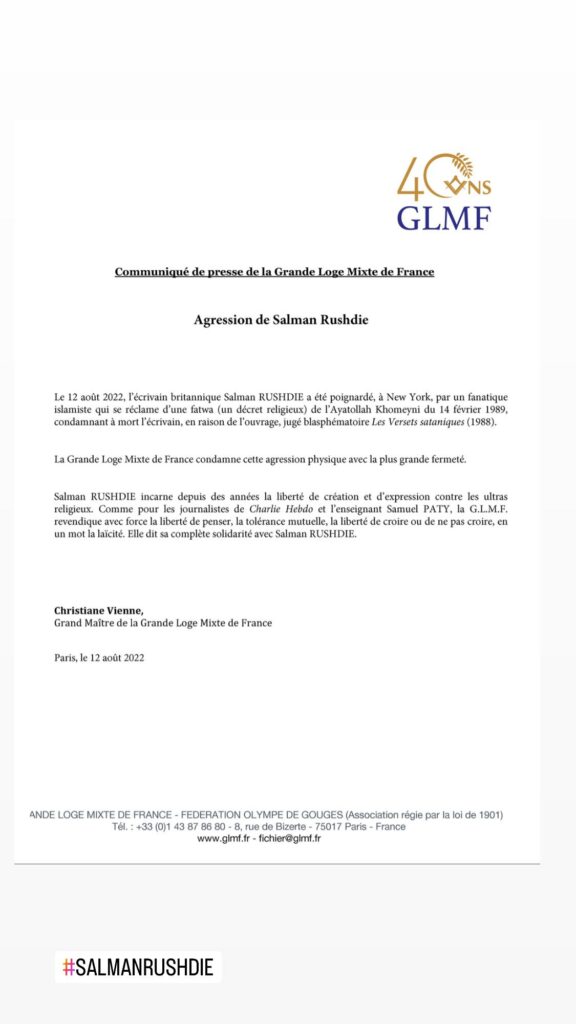 AGRESSION DE SALMAN RUSHDIE – GRANDE LOGE MIXTE DE FRANCE