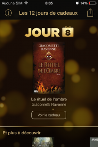 Pour ce huitième jour, le jeudi 02 janvier 2014, Apple offre le livre « Le rituel de l’ombre » écrit par Giacometti Ravenne. Le commissaire Antoine Marcas, maître maçon et Jade Zewinski, responsable de la sécurité de l’ambassade de France à Rome vont mener l’enquête ensemble et se trouver confrontés aux tueurs implacables d’une confrérie occulte, la société Thulé, adversaire ancestrale de la maçonnerie.