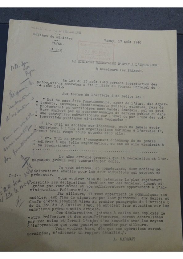 Le 17 août 1940, quatre jours après la loi interdisant l’appartenance à la franc-maçonnerie, le ministre de l’Intérieur adresse aux préfets une circulaire leur enjoignant de s’appliquer à eux-mêmes et aux fonctionnaires sous leur autorité les dispositions de la loi du 13 août 1940 promulguée au journal officiel le 14. Si le mot « franc-maçonnerie » n’apparaît jamais dans la loi d’août 1940, il n’y a aucune ambiguïté dans l’esprit de ceux chargés de l’appliquer comme de ceux qui en sont les victimes potentielles.