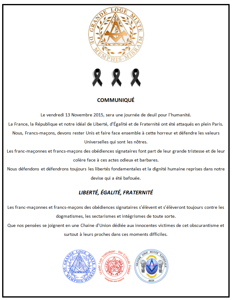 Attentats de Paris : Communiqué de la GLMMM Communiqués | 14 novembre 2015 | 0 | by A.S. Attentats de Paris du 13 novembre 2015: Communiqué de la Grande Loge Mixte de Memphis Misraïm (GLMMM)