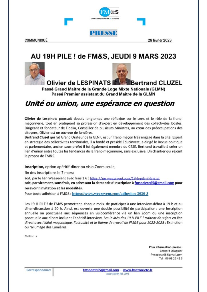 Les 19 H PILE ! de FM&S permettent, chaque mois, de participer à une interview-débat à 19 h et au