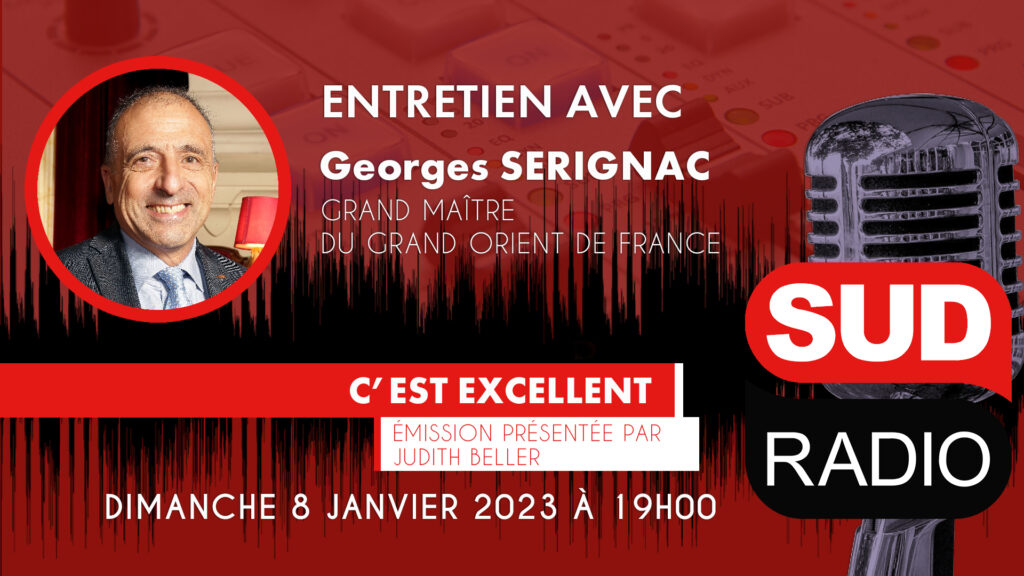 Entretien avec Georges SERIGNAC, Grand Maître du Grand Orient de France dans l’émission « C’est Excellent », présentée par Judith BELLER dimanche 8 janvier 2023 à 19h sur Sud Radio.