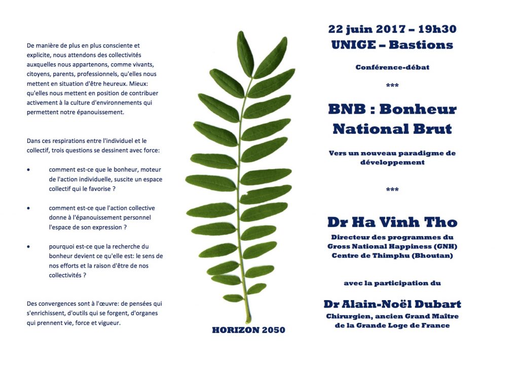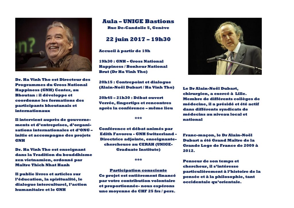 Genève – 22 juin 2017 – 19h30 l’Université de Genève (UNIGE – Bastions) organise une Conférence-débat sur le thème « BNB : Bonheur National Brut Vers un nouveau paradigme de développement » avec :