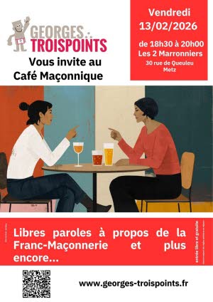 L’association Georges Troispoints Moselle organise un café maçonnique ouvert à toutes et à tous, le vendredi 13 février 2026, de 18h30 à 20h00, au Café Les Deux Marronniers, situé 30 rue de Queuleu à Metz.
