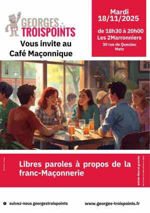 Le 18 novembre 2025, de 18h30 à 20h00, se tiendra un Café Maçonnique au Café Les Deux Marronniers, situé 30 rue de Queuleu, à Metz.