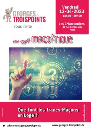 Le 12/04/2024 à 18h30, l’association Georges Troispoints Moselle organise une café maçonnique au Café Les 2 Maronniers -30, rue de Queuleu à METZ