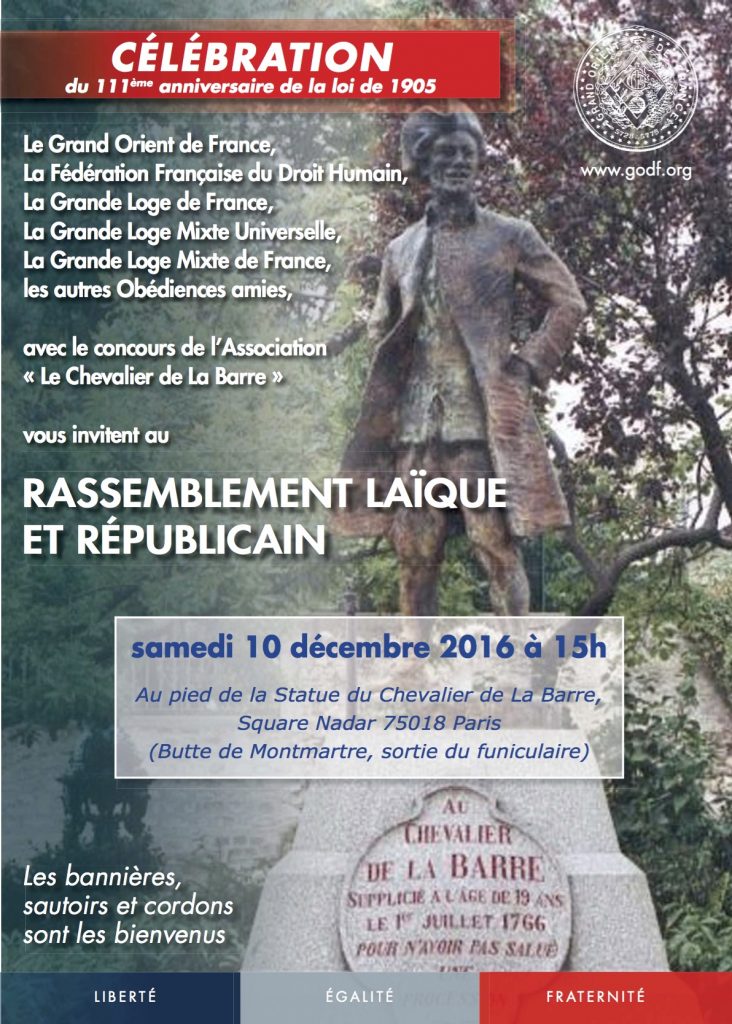 Paris – Samedi 10 décembre 2016 à 15 heures, rassemblement laïque et républicain à l’occasion du 111° anniversaire de la Loi de 1905.