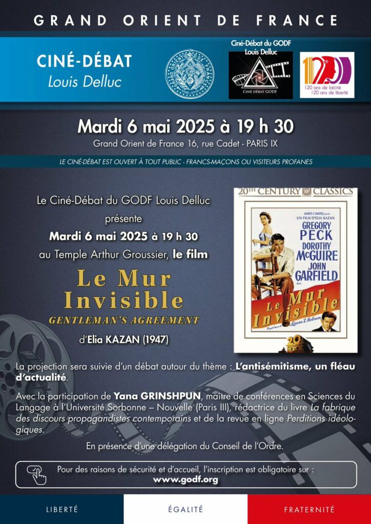 Ciné-débat du GODF – Louis Delluc mardi 6 mai 2025 à 19h30 à Paris : Projection du film « Le Mur Invisible » d’E. KAZAN, suivie d’un débat autour du thème : L’antisémitisme, un fléau d’actualité.