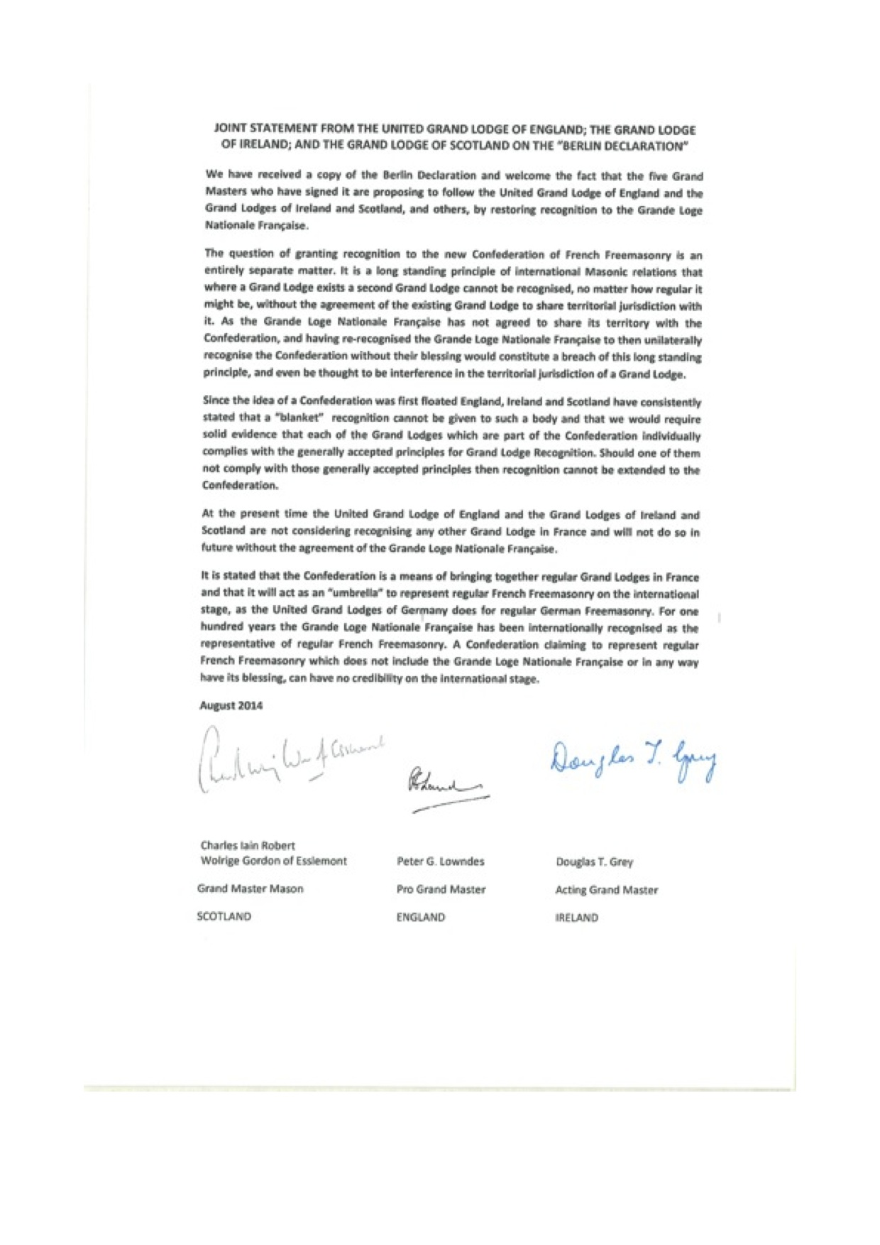 La Grande Loge Unie d’Angleterre (UGLE ou GLUA), la Grande Loge d’Irlande et la Grande Loge d’Ecosse ont publié ces jours derniers un « joint statement » ou déclaration commune sur la Déclaration de Berlin et donc la Confédération Maçonnique de France (CMF)