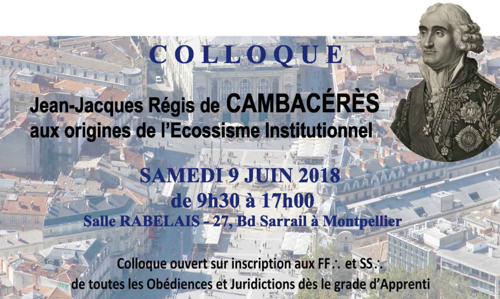 Le Grand Collège des Rites Ecossais du GODF, Suprême Conseil du 33e degré en France, organise un colloque « Jean-Jacques Régis de Cambacérès, aux origines de l’Écossisme institutionnel ». Sur inscription et présentation de la carte d’identité́ maçonnique.