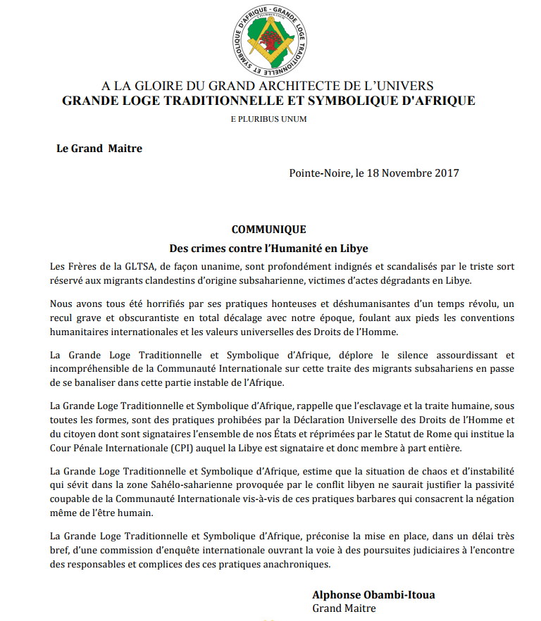 COMMUNIQUE DE LA GLTSA – DES CRIMES CONTRE L’HUMANITE EN LYBIE Communiqués | 26 novembre 2017 | 0 | by A.S.
