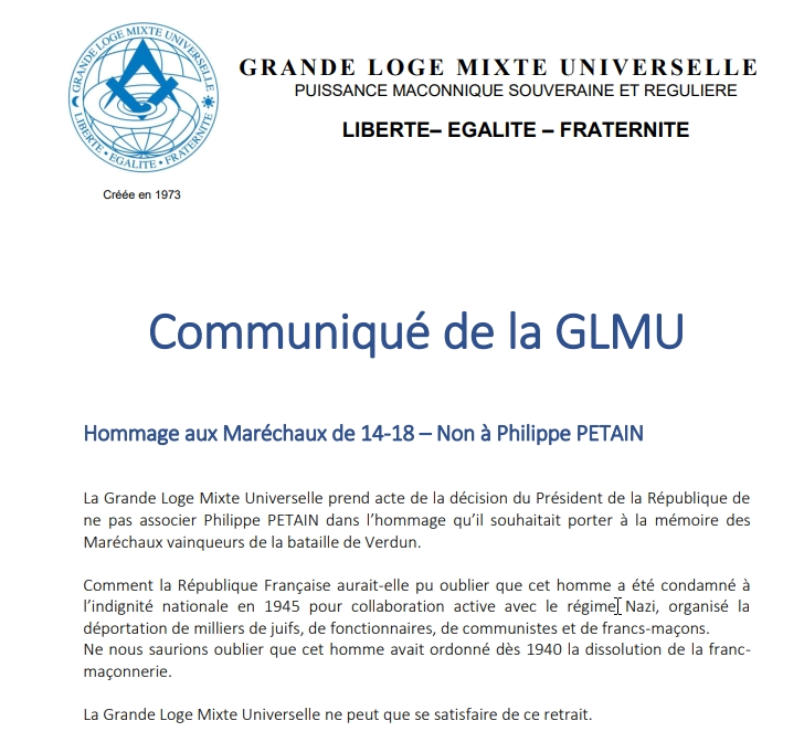 La Grande Loge Mixte Universelle prend acte de la décision du Président de la République de ne pas associer Philippe PETAIN dans l’hommage qu’il souhaitait porter à la mémoire des