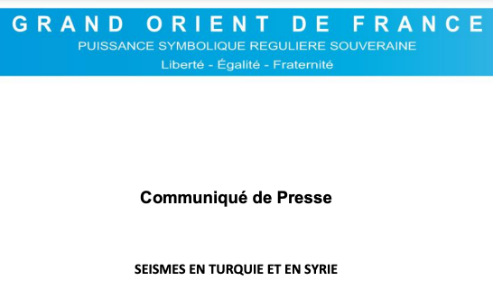 A la suite du double séisme aux conséquences dévastatrices qui a touché lundi le sud de la Turquie et le nord-ouest de la Syrie, le Grand Orient de France tient à présenter ses condoléances aux familles des victimes et exprimer toute sa solidarité à l’ensemble des blessés et des sinistrés.