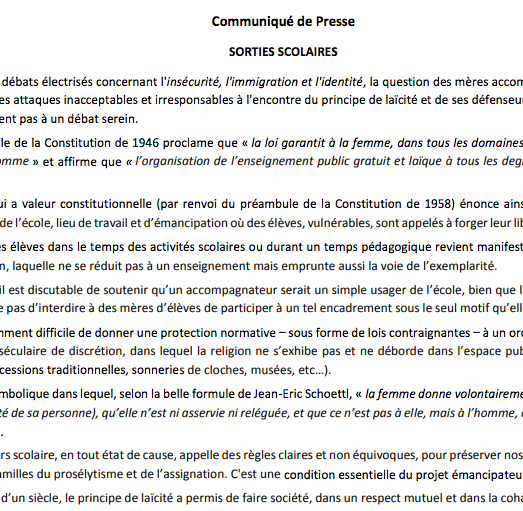 Un communiqué de presse inter-obédientiel ( GODF, DH, GLFF, GLDF, GLTSO, GLMUet GLMF) à propos du débat sur l’encadrement des sorties scolaires par des personnes voilées.