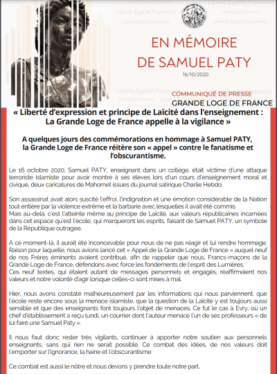 Communiqué de presse Grande Loge de France : « « Liberté d’expression et principe de Laïcité dans l’enseignement : La Grande Loge de France appelle à la vigilance »