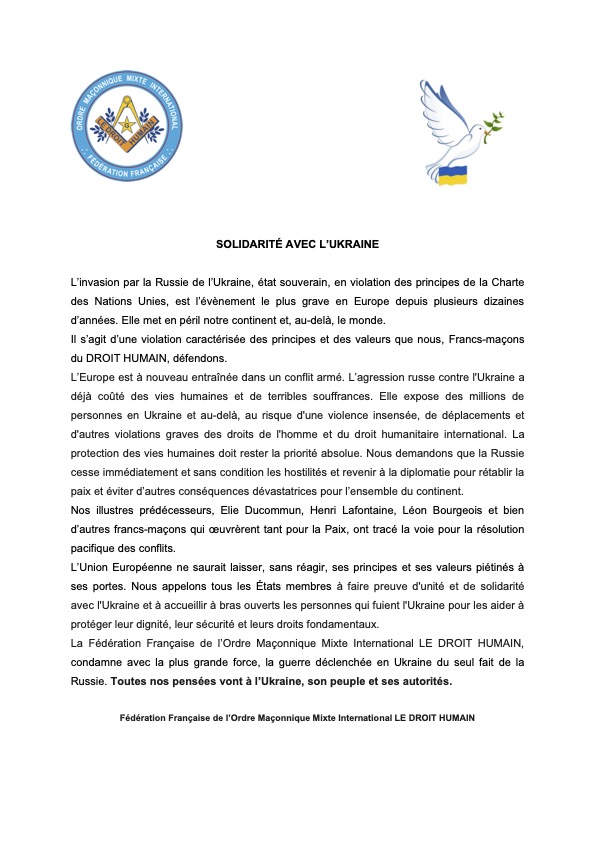 COMMUNIQUE – SOLIDARITE AVEC L’UKRAINE – DROIT HUMAIN