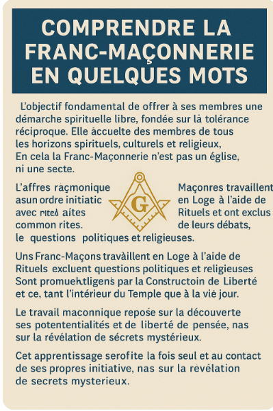 L’objectif fondamental de la Franc-Maçonnerie est d’offrir à ses membres une démarche spirituelle libre, fondée sur la tolérance réciproque. Elle accueille des hommes et des femmes de toutes origines spirituelles, culturelles ou religieuses. En cela, la Franc-Maçonnerie n’est ni une Église, ni une secte, mais un espace d’émancipation intérieure.