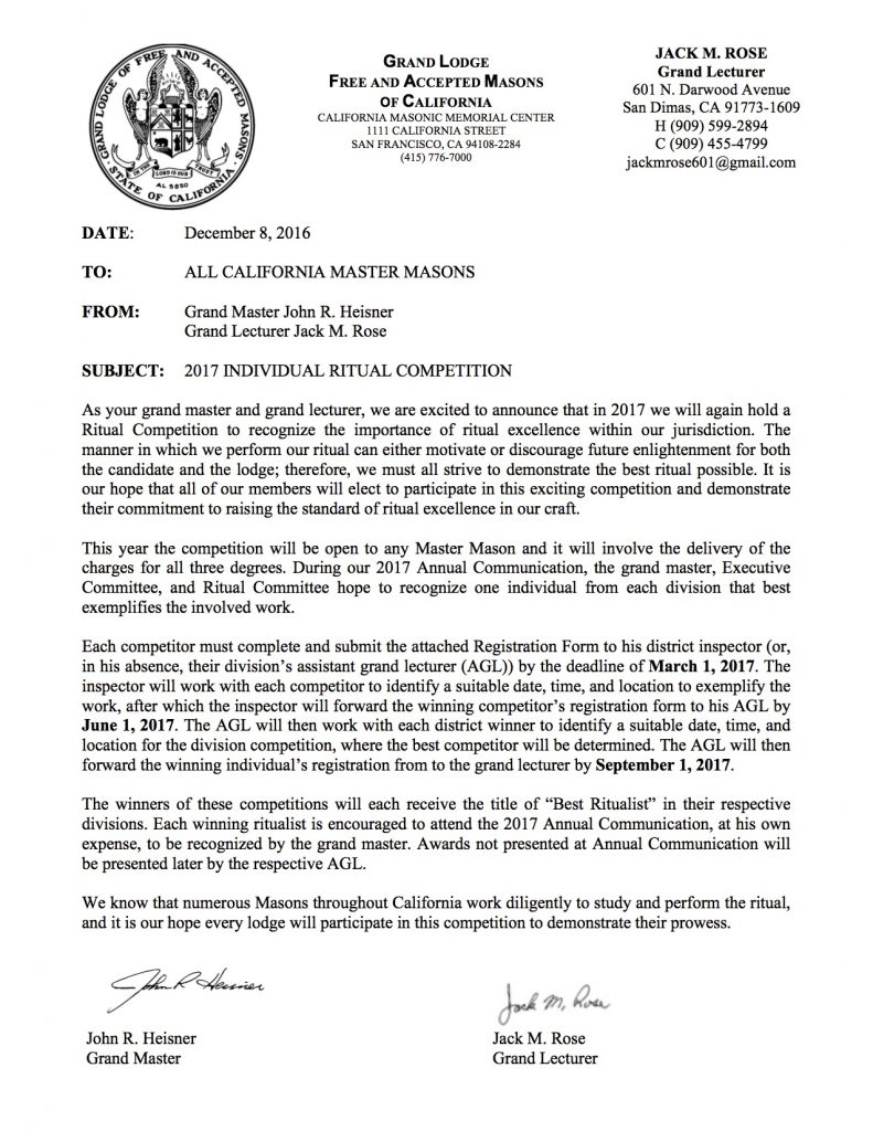 La Grande Loge de Californie organise pour 2017 la « 2017 INDIVIDUAL RITUAL COMPETITION » ou concours du meilleur ritualiste dans chaque degré.