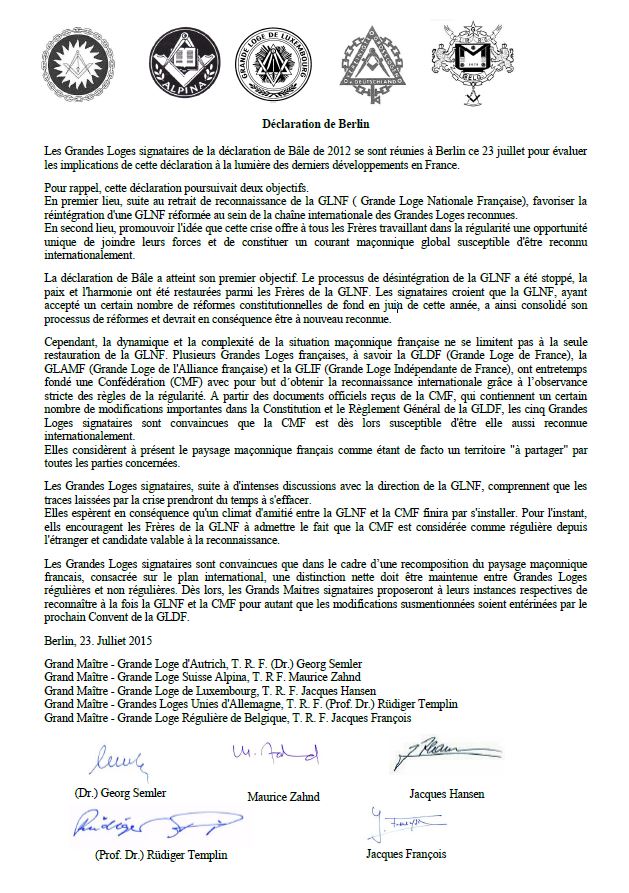 La Confédération Maçonnique de France (CMF) prend acte avec une grande satisfaction de la Déclaration de Berlin de ce 23/07/2014, faisant suite à celles de Bâle (10/06/2012) et de Vienne (29/01/2014) des cinq signataires, les Grandes Loges Unies d’Allemagne, la Grande Loge d’Autriche, la Grande Loge Régulière de Belgique, la Grande Loge du Luxembourg et la Grande Loge Suisse-Alpina.