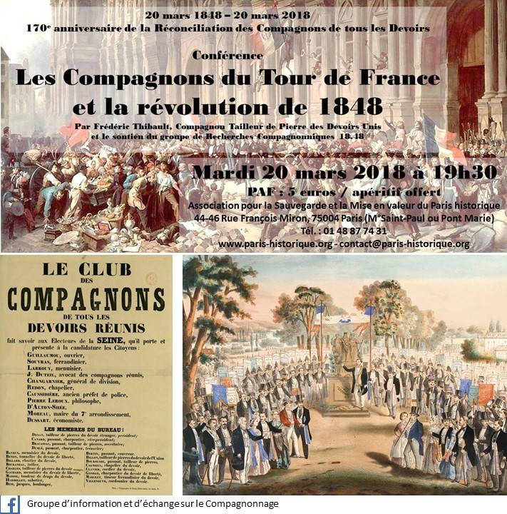 Paris – Mardi 20 mars à 19 heures 30 à l’occasion du 170° Anniversaire des la Réconciliation des Compagnons de tous les Devoirs, une conférence est proposée sur le thème « Les Compagnons du Tour de France et la révolution de 1848 » avec Frédéric Thibault, Compagnon Tailleur de Pierre des Devoirs Unis.