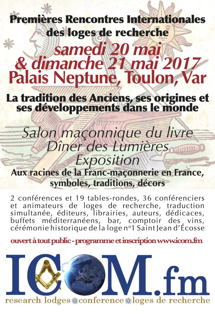 Toulon – La Grande Loge de France (GLDF) et les loges de recherche nationale Marquis de La Fayette, et régionale Mare Nostrum organisent les 19-20-21 mai 2017 les 1ères Rencontres internationales des loges de recherche (ICOM)
