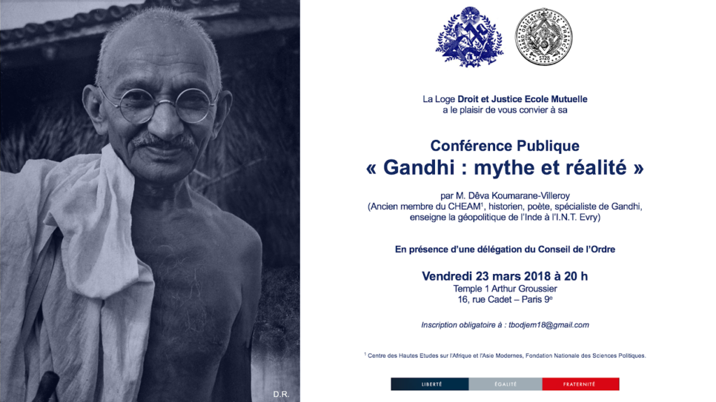 Paris – Dans le cadre de la commémoration du 70 ème anniversaire de la mort de Gandhi, la loge Droit et Justice – École Mutuelle du GODF organise le Vendredi 23 mars 2018 à 20h00 une conférence publique où M. Devâ Koumarane-Villeroy , historien, planchera sur le thème : Gandhi : Mythe et Réalité.