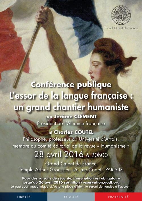 Paris – 28 avril 2016 à 20 heures – Conférence publique sur le thème « L’essor de la langue française : un grand chantier humaniste« par Jérôme CLÉMENT, Président de l’Alliance française et Charles COUTEL, philosophe, professeur à l’Université d’Artois, membre du comité éditorial de la revue « Humanisme »